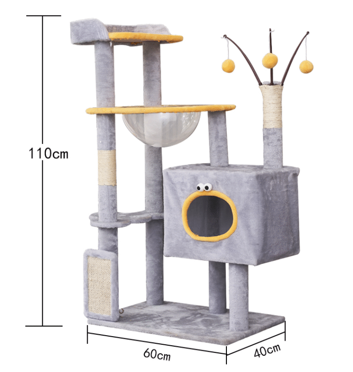 This 110cm cat tree combines modern aesthetics with functional design, offering cats multiple activity zones within a stylish structure. The sophisticated gray plush covering accented with warm yellow details creates an attractive piece that complements contemporary home decor while meeting your cat’s natural needs.