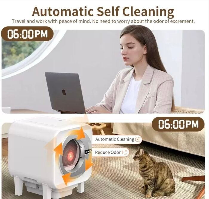 Smart Self-Cleaning Technology The intelligent cleaning mechanism automatically activates after your cat exits, efficiently separating waste while preserving clean litter. This automated process reduces odor, maintains hygiene, and saves you time on daily scooping.